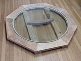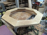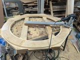 Test layout of the train inset in the under construction dining room table. The outside of that ring will get veneer on the outside, there'll be glass on top, with a wood edge.