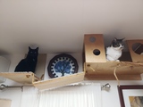 Greta is trying very hard to not look like she climbed up there specifically to intimidate Bagheera.